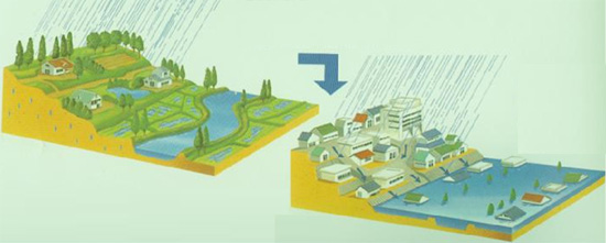 城市化發(fā)展迅速,不透水面積增加,透水面積減少,城市徑流加大,大雨時地勢低洼處易出現(xiàn)內(nèi)澇情況。