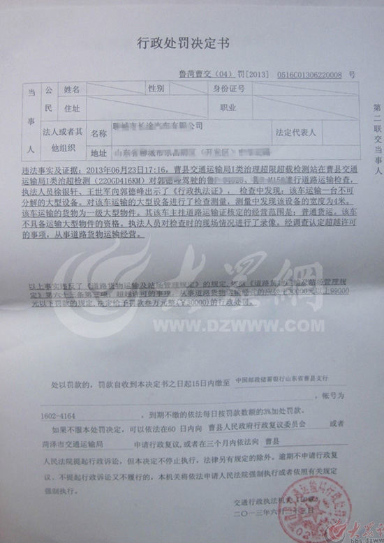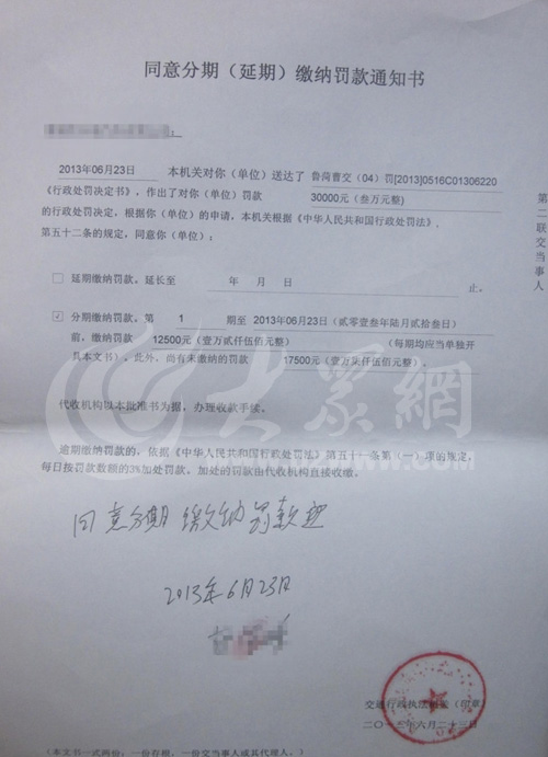 在帖子所附的《行政處罰決定書》上,大眾網(wǎng)記者看到,關(guān)于違法事實(shí)及證據(jù)一項(xiàng)寫著:檢查中發(fā)現(xiàn),該車運(yùn)輸一臺(tái)不可分解的大型設(shè)備。對(duì)該車運(yùn)輸?shù)拇笮驮O(shè)備進(jìn)行了檢查測(cè)量,測(cè)量中發(fā)現(xiàn)該設(shè)備的寬度為4米。該車運(yùn)輸?shù)呢浳餅橐患?jí)大型物件。該車主《道路運(yùn)輸證》核定的經(jīng)營(yíng)范圍是:普通貨運(yùn)。該車不具備運(yùn)輸大型物件的資格。以上事實(shí)違反了《道路貨物運(yùn)輸及站場(chǎng)所管理規(guī)定》的規(guī)定,依據(jù)《道路貨物運(yùn)輸及站場(chǎng)管理規(guī)定》第六十三條第三項(xiàng):超越許可的事項(xiàng),從事道路貨物運(yùn)輸經(jīng)營(yíng)的應(yīng)處以30000元以上99000元以下罰款的規(guī)定,決定給予處罰款叁萬(wàn)元整(¥30000)的行政處罰。在《同意分期(延期)繳納罰款通知書》上則寫明,罰款分兩期交,第一期為12500元,第二期為17500元。