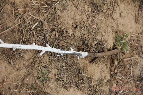 3月23日,菏澤論壇網(wǎng)友“逮啥拍啥”發(fā)布名為《林場200余株果苗全竟是樹枝,坑爹!》的帖子。帖子說:鄆城縣陳坡鄉(xiāng)林場被人栽上樹枝充當果苗,被插在地里“充樹”的梨樹枝大約有200株,上面還刷了白灰,用手輕輕一提,“樹苗”就被輕松拔了出來,在麥田旁還堆放著一些沒有“栽”的樹枝。網(wǎng)友將從地里拔出來的“樹苗”帶到菏澤市林業(yè)局進行咨詢,工作人員說梨樹枝使用“扦插”的方式根本無法成活,而這種種植方式也不能稱為“扦插”。
