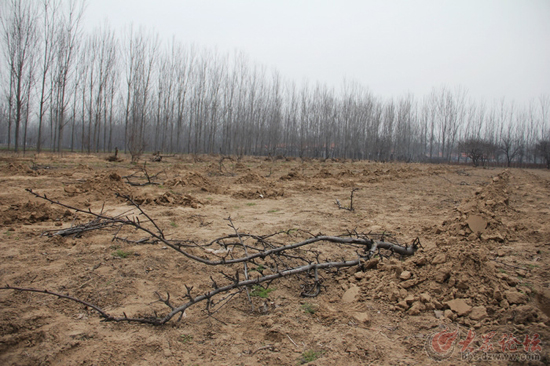 就在大眾網(wǎng)記者進(jìn)行采訪時(shí),林場(chǎng)負(fù)責(zé)人王文彥來到現(xiàn)場(chǎng)。面對(duì)七八位農(nóng)民的責(zé)問,王文彥一時(shí)說不出話。在種植戶面前,記者問王文彥,是不是他讓農(nóng)戶種上樹枝的?他沒有回答,只說:“這塊地我會(huì)補(bǔ)上果苗!