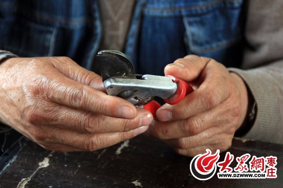 于庭柏桌上有一把被布套包裹著的剪刀,那是諾博送給他的一把價(jià)值400元的德國產(chǎn)果木修剪剪刀,于庭柏非常珍惜,而在剪刀刀片上有一個(gè)小豁口,說起來著實(shí)讓于庭柏心疼不已!爱(dāng)時(shí)諾博將這把剪刀剛送給我時(shí),和他一起修剪枝條,光顧著和他說話,一沒注意剪到了鐵絲,便留下這一豁口。”于庭柏小心地拿起剪刀摸了又摸,“我一直沒舍得用,直到去年,我自己買的剪刀也壞了,才換成這把,剪的時(shí)候可愛惜著哪!庇谕グ匦⌒牡貙⒓舻吨匦卵b進(jìn)布套里說道。