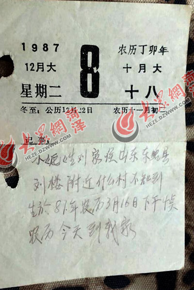 “小妮姓劉家住山東東名(明)縣劉樓附近什么村不知到(道),生于87年農(nóng)歷3月16日下午4點(diǎn),農(nóng)歷今天到我家!2006年,養(yǎng)父去世后,郭小妮發(fā)現(xiàn)了這張寫有自己身世的日歷表。從那一刻起,“尋親”這個(gè)念想便一直伴隨著郭小妮。