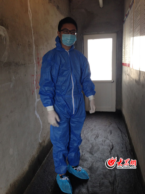大眾網(wǎng)記者穿好防護服,準備進入雞舍。