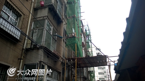 濟(jì)南“膠帶樓”第三、第四單元前搭建起了腳手架,水泥窗欞已基本拆除完畢。記者 馬俊驥 攝