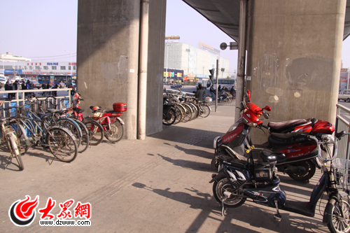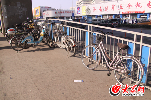 自行車橫七豎八、摩托車電動車隨處亂停,這是記者今天上午在北園路BRT公交歷山路站看到的一幕。粗略一數(shù),原本就不寬敞的BRT站臺兩側(cè)竟然停放了20余輛自行車。記者觀察到,這些自行車兩輛“一伙”、三輛“一堆”,更有甚著直接倚靠在站臺欄桿上。原本四五米寬的站臺只留下大約2米的寬度供行人通行。