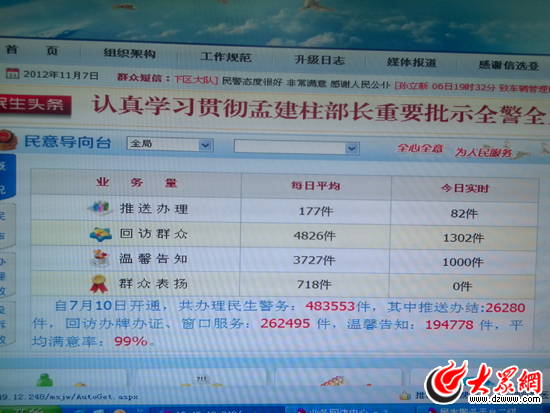 大眾網(wǎng)濟(jì)南11月8日訊(記者 韋輝)“想落戶口,不管是直接去公安局,還是打濟(jì)南市政府市民服務(wù)熱線‘12345’求助,甚至是去信訪辦,最后都會轉(zhuǎn)到我們派出所戶籍科來辦理”在濟(jì)南市公安局推出民生警務(wù)平臺后,來自48個渠道的訴求信息都在一個平臺上快速流轉(zhuǎn),不僅節(jié)省了大量人力,而且大大提高了辦事效率,辦結(jié)時間比傳統(tǒng)模式縮短近70%。7日上午,記者走進(jìn)濟(jì)南市公安局實地體驗民生警務(wù)平臺的便捷、高效運(yùn)轉(zhuǎn)。