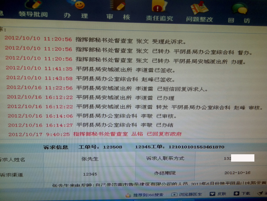記者注意到,從市民致電“12345”,到警務(wù)平臺自動接收,工作人員推送以及民警的辦理、回復(fù)等所有流程都在警務(wù)平臺上顯示一清二楚。“任務(wù)分到負(fù)責(zé)民警身上,要求在多長時間辦理完畢或者給群眾答復(fù),都有明確規(guī)定”工作人員說,除了辦案民警在平臺上顯示外,民警所在分局誰來督促都有明確記錄,除此之外,市局領(lǐng)導(dǎo)登錄平臺也能看到分管部門的辦理情況以及滿意度,這對民警也是一個監(jiān)督。所以程序公開以及層層監(jiān)督,大大提高了民警辦案的效率和責(zé)任心。