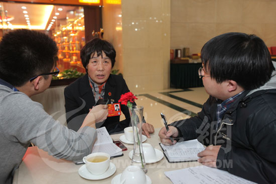 十二屆全國(guó)人大代表、山東曹縣誠(chéng)輝毛皮經(jīng)貿(mào)有限公司業(yè)務(wù)經(jīng)理、車間主任沙元菊就農(nóng)村養(yǎng)老問(wèn)題回答大眾網(wǎng)網(wǎng)友的提問(wèn)。(大眾網(wǎng)特派記者 盛堃 攝)