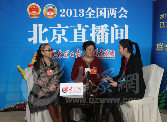 全國人大代表、曹縣磐石辦事處五里墩村黨支部書記、銀香偉業(yè)集團董事長王銀香(中)和全國人大代表、青島農業(yè)大學科技處副處長、山東布萊凱特黑?萍脊煞萦邢薰径麻L董雅娟(左)做客大眾網北京直播室(特派記者 韋輝 攝)