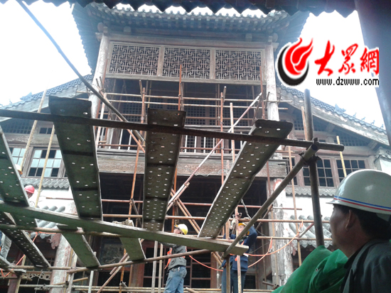 工人們正在搭建腳手架,準備對題壁堂進行修繕。大眾網(wǎng)記者 李兆輝 攝