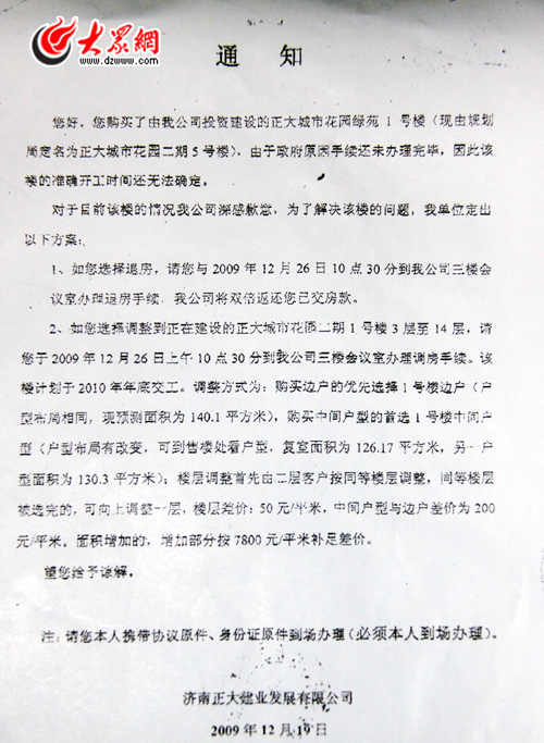 原定的本月20日開發(fā)商向業(yè)主進(jìn)行“最后解釋”,卻被臨時取消。大眾網(wǎng)記者繼續(xù)跟蹤報(bào)道,19日,開發(fā)商終于向每位業(yè)主寄出了一份書面《通知》,這也是三年來濟(jì)南正大建業(yè)首次正面回答業(yè)主,并提出了明確的處理意見。