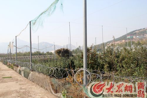大眾網(wǎng)記者繼續(xù)往山下走,沿途的果樹林看起來(lái)要“珍貴”很多,道路兩旁增設(shè)了鐵網(wǎng)圍擋,圍擋頂部新安裝了鐵蒺藜,里面的蘋果樹上還加了一層透明網(wǎng)罩,遠(yuǎn)遠(yuǎn)能看見樹上碩果累累,誘人的大蘋果已經(jīng)成熟。