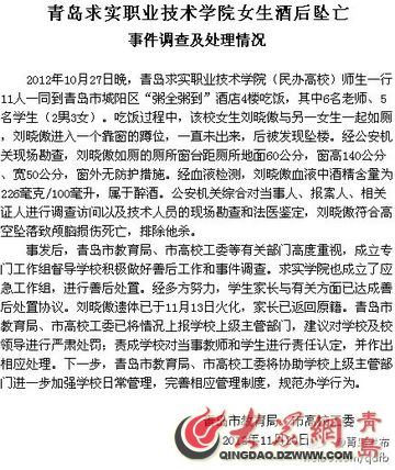 @青島發(fā)布在微博中稱:2012年10月27日晚,青島求實(shí)職業(yè)技術(shù)學(xué)院(民辦高校)師生一行11人一同到青島市城陽(yáng)區(qū)“粥全粥到”酒店4樓吃飯,其中6名老師、5名學(xué)生(2男3女)。吃飯過(guò)程中該校女生劉曉傲與另一女生一起如廁,劉曉傲進(jìn)入一個(gè)靠窗的蹲位,一直未出來(lái),后被發(fā)現(xiàn)墜樓。經(jīng)公安機(jī)關(guān)現(xiàn)場(chǎng)勘查,劉曉傲如廁的廁所窗臺(tái)距廁所地面60公分,窗高140公分、寬50公分,窗外無(wú)防護(hù)措施。經(jīng)血液檢測(cè),劉曉傲血液中酒精含量為226毫克/100毫升,屬于醉酒。公安機(jī)關(guān)綜合對(duì)當(dāng)事人、報(bào)案人、相關(guān)證人進(jìn)行調(diào)查訪問(wèn)以及技術(shù)人員的現(xiàn)場(chǎng)勘查和法醫(yī)鑒定,劉曉傲符合高空墜落致顱腦損傷死亡,排除他殺。
