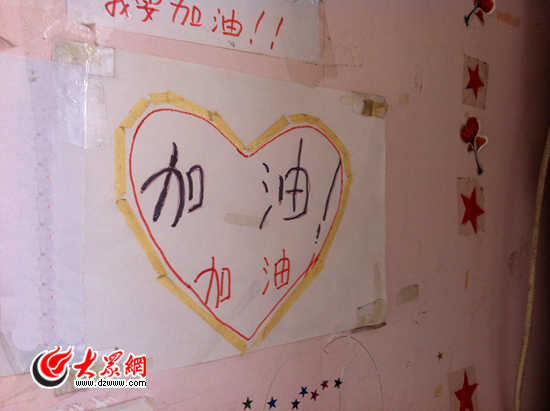 在濟(jì)南基愛智障人士服務(wù)中心教室的墻上,貼滿了學(xué)員們“加油”字樣的畫。記者 馬俊驥 攝