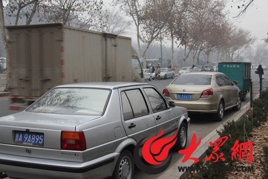 除了快車道堵車嚴(yán)重,文化西路部分路段的副道也被當(dāng)成了露天停車場。12月19日,記者來到文化西路實地探訪時發(fā)現(xiàn),該路從青年東路交叉口往東至歷山路這一段,兩側(cè)快車道及副道幾乎沒有亂停車的現(xiàn)象,偶然有也是即停即走。然而從青年東路路口往西,簡直就是一番令人驚訝的場景:快車道兩側(cè)都停滿了機動車輛!更為嚴(yán)重的是,從省中醫(yī)至齊魯醫(yī)院附近的路段,不光是兩側(cè)快車道,就連副道也被從全省各地來醫(yī)院看病的車輛停得滿滿的。