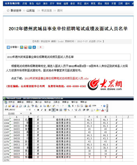 7月27日,網(wǎng)友“蹦蹦強”發(fā)表的一篇帖子在德州論壇引起關(guān)注:“德州武城事業(yè)編9分進(jìn)面試,哈哈,我考我也能進(jìn)!痹谔又,網(wǎng)友貼出了《德州市武城縣2012年事業(yè)單位招聘筆試總成績及面試人員》的表格文件。
