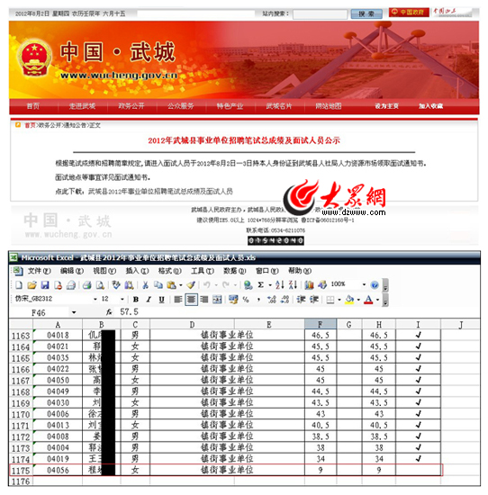 網(wǎng)友“蹦蹦強”貼出的這份名單來源是哪,是否屬實?隨后,大眾網(wǎng)記者找到武城縣人民政府網(wǎng)站,在其頁面上的“通知公告”一欄中,記者找到了“2012年武城縣事業(yè)單位招聘筆試總成績及面試人員公示”的頁面并下載了一份總成績及面試人員名單。