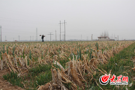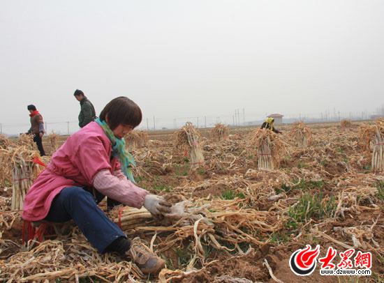在章丘慶元村,村民們將大蔥刨出并捆好,準(zhǔn)備發(fā)往河南市場(chǎng)。