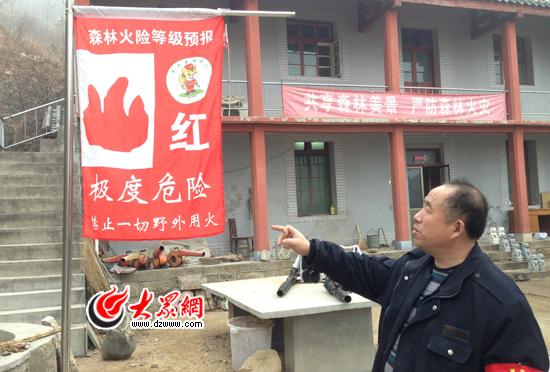 1月31日,沿著崎嶇的山路,大眾網(wǎng)記者來到實驗林場。沿途到處可見“嚴(yán)禁野外用火”等森林防火的標(biāo)語,在重要路口懸掛著紅色森林火險等級的標(biāo)志。張興告訴大眾網(wǎng)記者,從1月29日開始,實驗林場的火險等級就提升到了紅色。