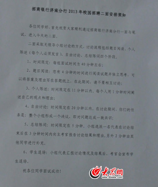 大眾網(wǎng)濟(jì)南12月15日訊記者 王磊 吳毅斐)12月13日,在招行濟(jì)南招聘驚現(xiàn)“拼爹門”引發(fā)網(wǎng)友熱議后,15日,招商銀行濟(jì)南分行2013年校園招聘面試在濟(jì)南如期舉行。現(xiàn)場兩位主考官均來自總行人力資源部,新華社、人民網(wǎng)、齊魯晚報(bào)、大眾網(wǎng)等中央和省級(jí)媒體的記者受邀旁聽了面試過程。“二面”采用無領(lǐng)導(dǎo)小組討論方式,當(dāng)場宣布進(jìn)入“三面”的結(jié)果。大眾網(wǎng)記者隨機(jī)采訪了部分“二面”落選者,他們對(duì)整個(gè)招聘的客觀和透明度表示認(rèn)可。