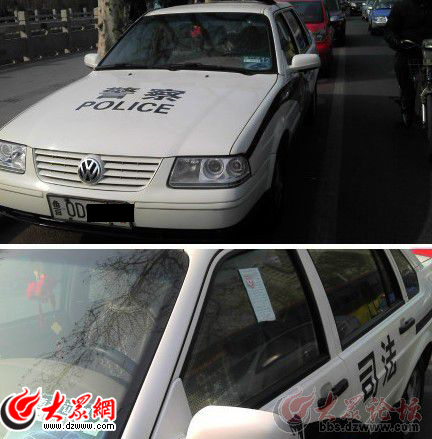 從網(wǎng)友上傳的圖片中,記者看到,被貼罰單的是輛掛有魯O牌照的白色警車,車門上噴有“司法”字樣。在違法停車告知單上,清楚的寫著:違法停車時(shí)間為2012年2月21日9時(shí)55分,違法停車地點(diǎn)為文化西路,單子下方還蓋有濟(jì)南市公安局交通警察支隊(duì)歷下區(qū)大隊(duì)的公章。