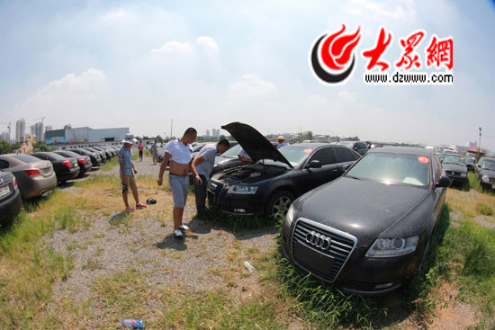 23日至25日,棗莊市一次性網(wǎng)絡(luò)拍賣公務(wù)用車103部,短短幾天吸引300多名購車者登記報(bào)名。圖為市民在拍賣公司停車場(chǎng)“相車”。
