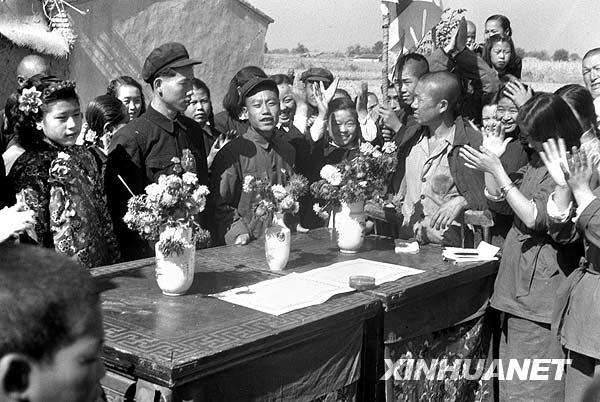 北京市第十四區(qū)農(nóng)民袁榮和本區(qū)楊淑英情投志合,于1951年10月8日在新婚姻法的保障下舉行了正式結(jié)婚典禮。新華社發(fā)(資料照片)