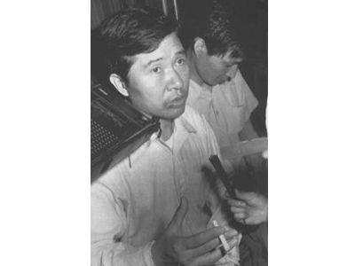 1973年8月14日,韓國,首爾:反對黨領(lǐng)導(dǎo)人金大中在東京飯店被綁架失蹤了一周,回到祖國后,金大中簡單的回答了記者提問。