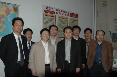 中共山東省委宣傳部副部長劉保聚(左五),大眾報業(yè)集團黨委副書記、副總編李壯利(左三),臨沂市委宣傳部副部長劉廣闊(左一),大眾網(wǎng)總編輯(右一),齊魯晚報副總編、今日沂蒙總編輯劉忠信(左四),大眾網(wǎng)臨沂頻道總編輯、臨沂大眾網(wǎng)主編王濟常(左二),大眾網(wǎng)增值業(yè)務中心主任范榮鵬(右二),臨沂大眾網(wǎng)技術部主任劉二陽(右三)合影留念