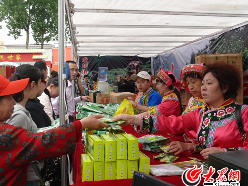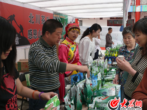 在北川羌族自治縣茗香茶廠的展位前,經(jīng)理趙義秀高興地告訴記者,不到半個小時的時間,她便賣出了100多斤茶 葉,收入1000多元。趙經(jīng)理說,濟(jì)南人的愛心和熱情讓她非常感動,“來買茶的顧客都會說一句‘買一袋茶獻(xiàn)一份愛心嘛’”。