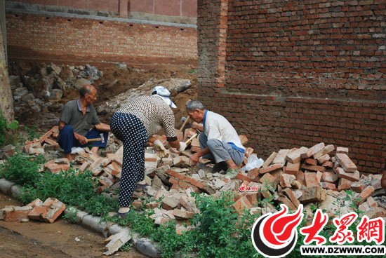 8月4日上午,剛剛8點(diǎn)多,外面已經(jīng)是烈日炎炎,氣溫早早的爬升到了30度,加上前兩天剛剛下過(guò)雨,水汽上蒸,顯得又熱又悶,喘不開(kāi)氣。在濟(jì)南市中區(qū)連接玉函北區(qū)和玉函南區(qū)的干道兩邊,由于要擴(kuò)建道路,原先馬路兩側(cè)的門(mén)頭房已經(jīng)全部拆除,只留下殘磚斷瓦的建筑垃圾。來(lái)自臨沂平邑宮家村的張老漢就在這里揮動(dòng)著手里的斧頭,和老伴忙活著砍磚。