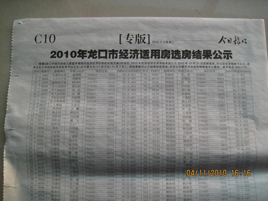 這份刊登在報(bào)紙上公告上寫(xiě)著“2010年龍口市經(jīng)濟(jì)適用房選房結(jié)果公示表根據(jù)《龍口市城市低收入家庭申請(qǐng)購(gòu)買(mǎi)經(jīng)濟(jì)適用住房的實(shí)施方案 》的規(guī)定……”難道,龍口的經(jīng)濟(jì)適用房都給了公務(wù)員嗎?公務(wù)員是當(dāng)?shù)氐牡褪杖爰彝幔亢芏嗑W(wǎng)友發(fā)出了這樣的疑問(wèn)。