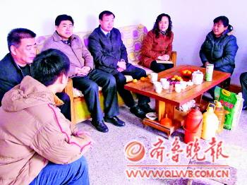 濟南大學(xué)副校長張碩秋(右二)、平陰縣委副書記劉業(yè)朝(右三)等在貧困生家中“家訪”! ”緢笥浾摺罘病z