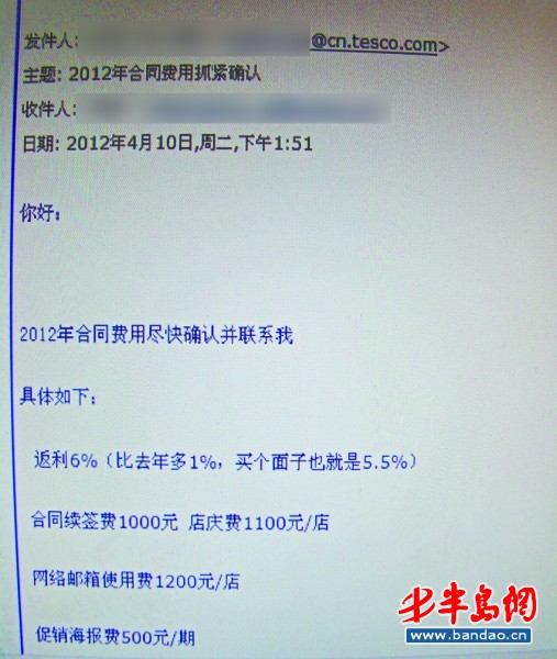 4月11日,青島市整規(guī)辦聯(lián)合市工商局等部門(mén)下發(fā)《關(guān)于對(duì)全市大型零售企業(yè)向供應(yīng)商違規(guī)收費(fèi)進(jìn)行聯(lián)合檢查工作的通知》,對(duì)大型商場(chǎng)向供應(yīng)商違規(guī)收費(fèi)情況開(kāi)始檢查。16日,有島城供應(yīng)商給本報(bào)報(bào)料,在與世界知名的大型超市樂(lè)購(gòu)超市簽訂供貨合同時(shí),對(duì)方要求供應(yīng)商繳納單品費(fèi)、網(wǎng)絡(luò)郵箱使用費(fèi),并且將返利費(fèi)用比去年增加一個(gè)百分點(diǎn)。