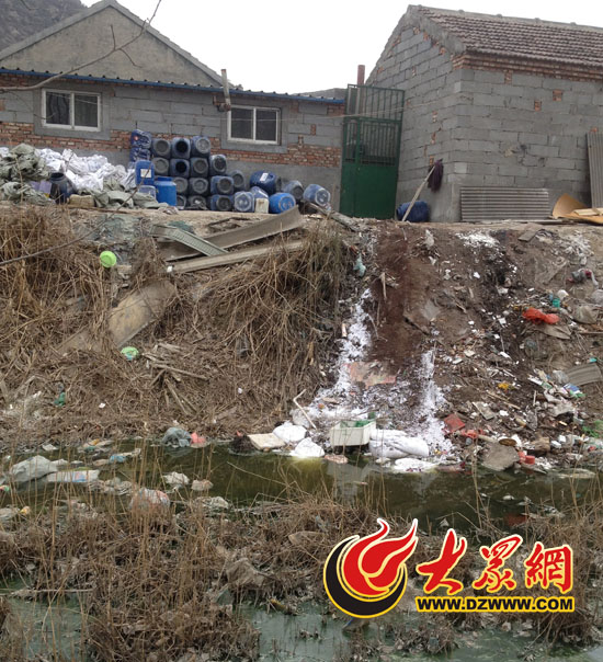 大眾網(wǎng)記者細數(shù)了一下,沿岸不到兩百米的范圍內(nèi),石材加工作坊就超過5家,而且每一家都設(shè)置了多個排污口,污水直接排入華山大溝。有的作坊竟把染料桶堆放在院子外面,堆得跟小山似的。在排污口附近的水域,堆積了大量白色沉淀物,附近的土壤上有一層厚厚的粉末,上面除了干枯的樹木,很少有植物生長。