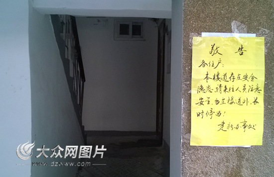 樓道門口貼出了街道辦事處的“敬告”。記者 馬俊驥 攝