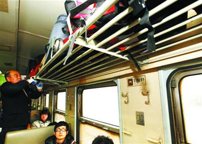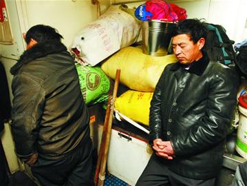 隨著開車時(shí)間的臨近,上車的人越來越多,最后一次忙春運(yùn)的老列車員袁春本車上車下忙前忙后地幫著乘客們找地方放行李。雖然站臺(tái)上很冷,但他的額頭上已經(jīng)冒出了汗珠,喘著粗氣說:“這趟車最大的特點(diǎn)是行李多。到年底了,農(nóng)民工和學(xué)生都需要把鋪蓋帶回家,所以每個(gè)人都帶著大大小小的行李,平均每個(gè)人都有2個(gè)行李包。因此,這趟車上的列車員還有一個(gè)角色,就是搬運(yùn)工。 ”