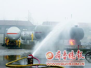 ▲10日,事發(fā)物流企業(yè)隔壁液化氣站的50噸液化氣罐仍有明火,消防員正在滅火!”緢笥浾摺≮w波 攝