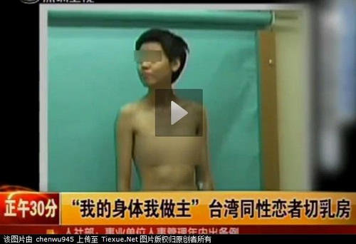 如今很多女明星為了搏出位,瘋狂展露自己的乳溝,且把這種乳溝稱(chēng)之為事業(yè)線(xiàn),而另外一方面有一部分的女同性戀卻對(duì)自己豐滿(mǎn)的胸部顯露不滿(mǎn),近日就有一名臺(tái)灣的女同性戀者將自己的胸部切除,還拍成了紀(jì)錄片,聲稱(chēng)“自己的身體自己做主”。