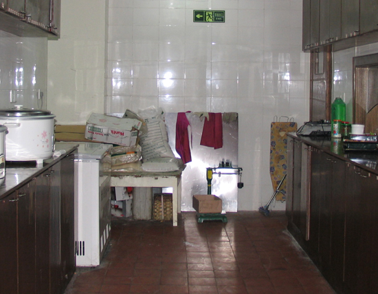 在去洗手間時(shí),沿著店內(nèi)張貼的衛(wèi)生間導(dǎo)向標(biāo)示,恰巧就走進(jìn)了這家店的廚房。在廚房中,我們看到了熨衣板、破紙殼箱、面粉、地秤、抹布、圍裙、竹筐、電飯煲、用過沒用過的方盤、餐盒堆放在一個(gè)房間內(nèi)。通過一個(gè)傳菜的窗口我們看到幾把爛拖布倒放在洗池邊上。這樣臟亂的廚房與店家宣傳的“ISO9001國際認(rèn)證企業(yè)”著實(shí)相距甚遠(yuǎn)。在廚房中我們拍下了幾張照片,在拍完照走出廚房之時(shí)才有人過來問“你們干什么?這是廚房不許拍照!”