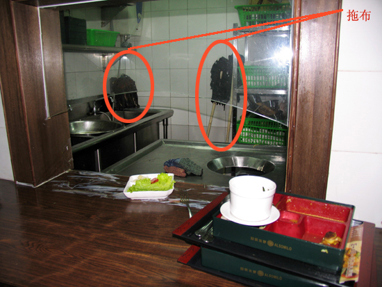 通過一個(gè)傳菜的窗口我們看到幾把爛拖布倒放在洗池邊上