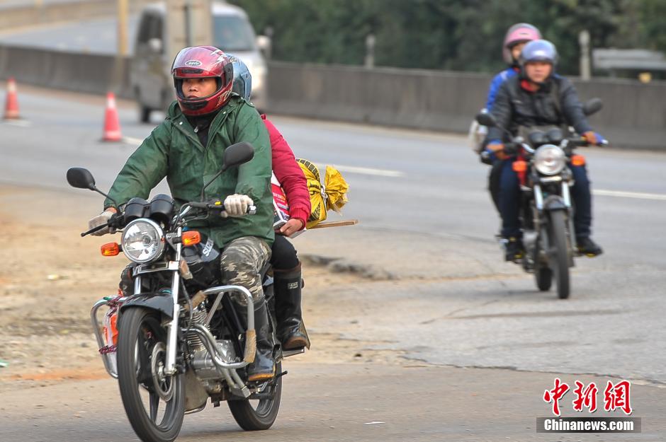 1月16日至24日,從廣東駕駛摩托車途經(jīng)廣西梧州返鄉(xiāng)的大軍已突破十萬,隨著春節(jié)臨近,每天過境的摩托車數(shù)量還將增加。梧州交警部門在部分縣市交界處設(shè)立春運(yùn)服務(wù)站,為返鄉(xiāng)民眾提供幫助。圖為1月24日,進(jìn)入梧州境內(nèi)的返鄉(xiāng)民眾。中新社發(fā)洪堅鵬攝