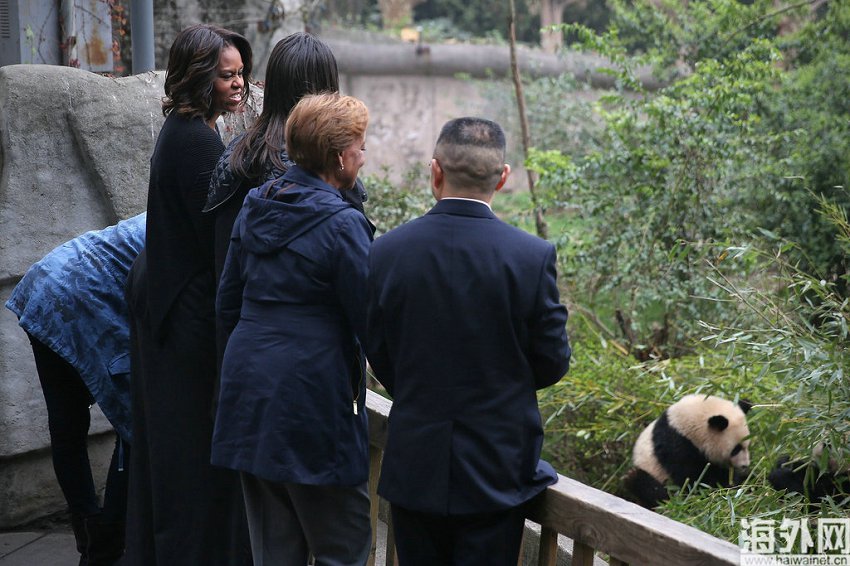 3月26日上午10時許,美國總統(tǒng)奧巴馬夫人米歇爾和她的母親以及兩個女兒一起走進成都大熊貓繁育研究基地,與她們期盼已久的大熊貓來了一次親密接觸。她們首先來到幼年大熊貓別墅,和這里的6只可愛大熊貓見面。22歲的大熊貓媽媽莉莉正帶著5只一歲多的大熊貓寶寶“奧莉奧”、“淼淼”、“圓潤”、“成雙”、“成對”開心地吃著竹子,憨態(tài)可掬。米歇爾及家人看得目不轉(zhuǎn)睛,大贊“可愛”,并不斷向工作人員詢問大熊貓的飲食起居情況。她們還前往太陽產(chǎn)房和大熊貓幼稚園,看望了大熊貓幼仔。