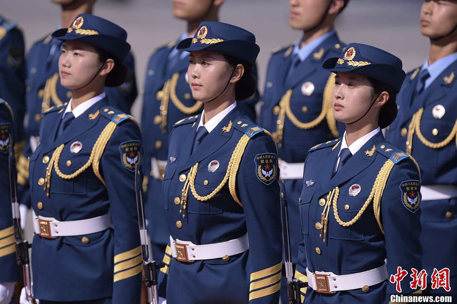 5月12日,中國國家主席習(xí)近平在北京人民大會堂東門外廣場舉行儀式歡迎土庫曼斯坦總統(tǒng)別爾德穆哈梅多夫訪華。中國人民解放軍三軍儀仗隊首現(xiàn)女儀仗兵身影。圖為儀式前儀仗兵作相關(guān)準(zhǔn)備。中新社發(fā) 廖攀 攝