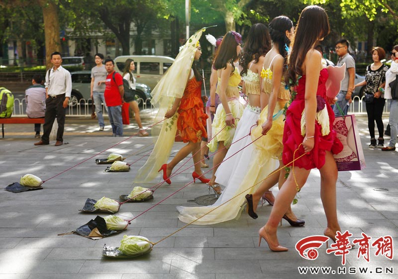 昨日下午5時20分,艷陽高照,微風徐徐。小寨十字的環(huán)形天橋上,7名身材高挑、穿著清涼的女子人手拉著一棵大白菜,出現(xiàn)在西安小寨天橋上,引來行人側(cè)目。這7名美女有的穿著輕紗質(zhì)地的演出服,有的用綠蘿藤條做裝飾搭在肩上,也有的直接用大白菜幫子粘接成一條裙子穿在身上……而更特別的是,她們都用繩牽著一棵白菜。“她們這是干什么呢?”圍觀者紛紛嘀咕。一名美女說,她們是在搞行為藝術(shù),以此表達她們的壓力和寂寞。另一女孩補充說:“現(xiàn)代人的生活節(jié)奏快,精神壓力大,沒朋友可以傾訴,即便有朋友傾訴,也不見得能幫你清除寂寞,大白菜也寂寞,又有隨時被丟棄的危險,看似遛白菜,其實是在遛自己!币慌試^的一名女士聽到這樣的答案后,很不屑地說:“現(xiàn)在的社會,誰沒有壓力,有壓力才有動力,就看你怎么看待了,但在大街上這么糟蹋白菜,真是太不尊重農(nóng)民的勞動成果了!”據(jù)了解,這種行為活動是一位行為藝術(shù)家發(fā)起的。有些圍觀群眾雖然不知道這些女孩在干嘛,但是看到好好的白菜被拖到地上,心疼地說:“這樣太糟踐食物”。(記者苗巧穎)
