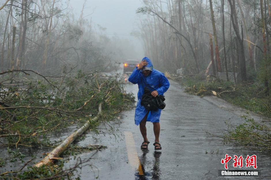 7月18日,據(jù)中央氣象臺(tái)消息,今年第9號(hào)臺(tái)風(fēng)“威馬遜”(超強(qiáng)臺(tái)風(fēng)級(jí))18日15時(shí)30分從海南省文昌市翁田鎮(zhèn)沿海登陸,登陸時(shí)中心附近最大風(fēng)力有17級(jí)(60米/秒),截止發(fā)稿,狂風(fēng)暴雨一直持續(xù)不斷。圖為前往“威馬遜”登陸點(diǎn)海南省文昌市翁田鎮(zhèn)的道路受阻,樹木被大風(fēng)攔腰折斷,一位記者艱難前行。駱云飛 攝