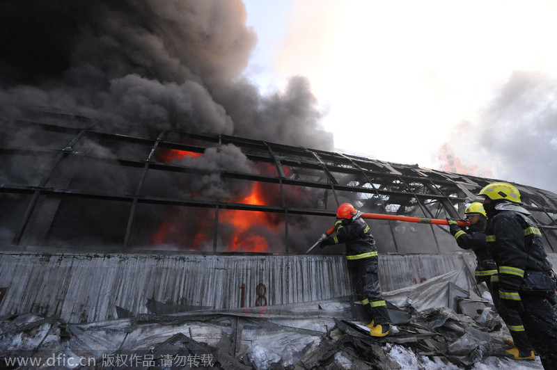 2015年1月2日13時,哈爾濱道外區(qū)南勛街與南頭道街附近的一個存放廚具的庫房起火,數(shù)公里外可見濃煙。圖為哈市消防支隊現(xiàn)場救援。