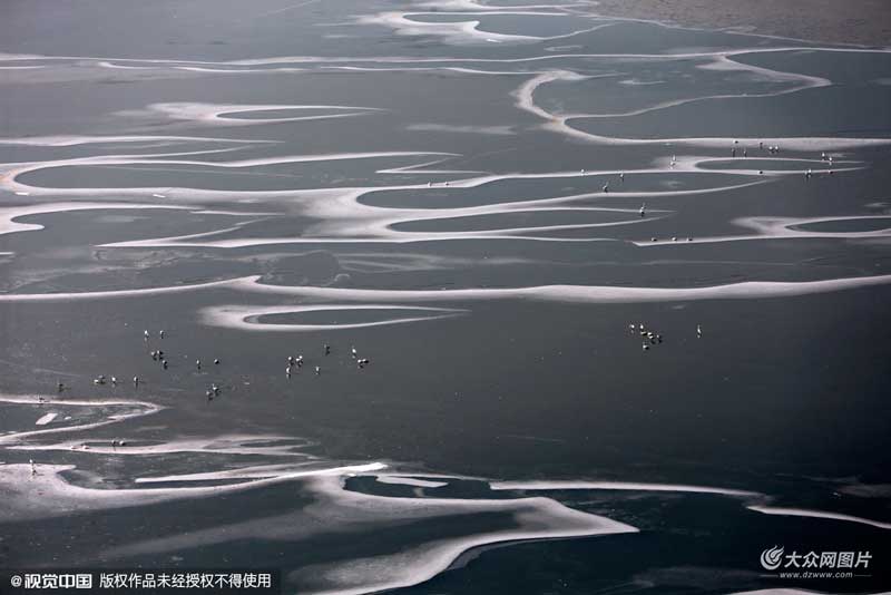 2016年1月26日,山西運(yùn)城,受極寒天氣影響,黃河山西平陸段出現(xiàn)大面積結(jié)冰。從空中俯瞰,冰層猶如蜿蜒曲折的白色絲帶浮于河面,夕陽(yáng)照射,“白色精靈”點(diǎn)綴,宛如精美的印象山水畫。