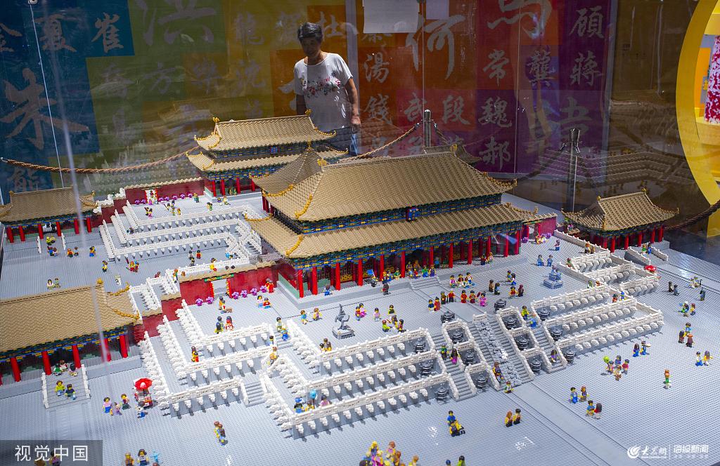 2019年9月4日,觀眾在北京參觀由50萬塊樂高積木搭建的“故宮三大殿”模型。日前,“方塊王潮——樂高中國(guó)文化藝術(shù)大展”在北京舉行,由樂高積木搭建的故宮、上海外灘、平遙古城等中國(guó)標(biāo)志性建筑以及京劇臉譜等中國(guó)傳統(tǒng)文化符號(hào)呈現(xiàn)在觀眾眼前。展覽將持續(xù)至9月10日。