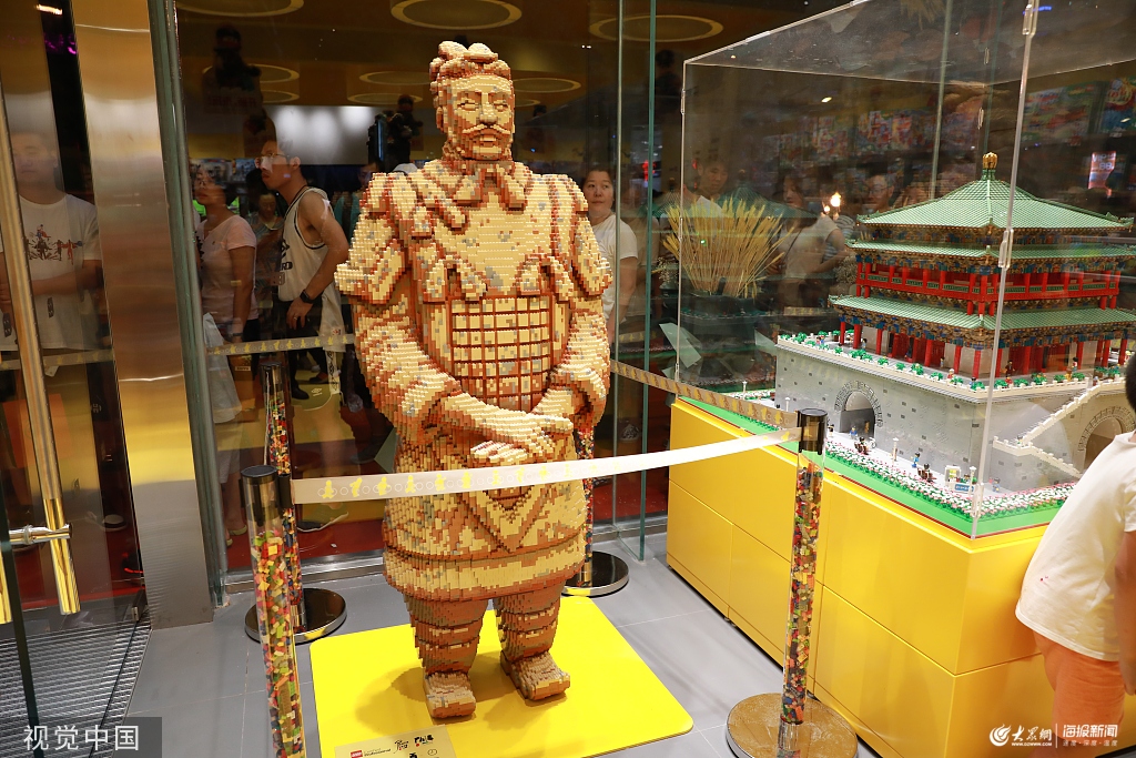 2019年7月31日,西安。近日,西安有家融入了多種本土元素和“黑科技”的樂高體驗(yàn)店,店內(nèi)兩個(gè)各由5.6萬塊樂高積木拼搭而成的彩色兵馬俑,高達(dá)1.9米,重165公斤,成為最好的“宣傳員”。高1.1米,用800個(gè)小時(shí)、由近12萬塊樂高積木拼搭而成的西安標(biāo)志性建筑鐘樓,也讓不少顧客直呼“厲害”。